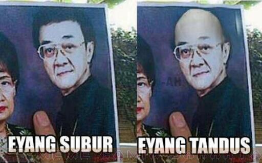 Namun para pengguna internet Indonesia juga tak mau ketinggalan topik ini, salah satunya ialah para pembuat gambar-gambar MEME. Ada-ada aja ulah mereka untuk mengekspresikan bagaimana sosok Eyang Subur tersebut. Berikut gambar MEME yang saya peroleh mengenai sosok Eyang Subur yang fenomenal dan Eyang Tandus yang menjadi tandingannya.